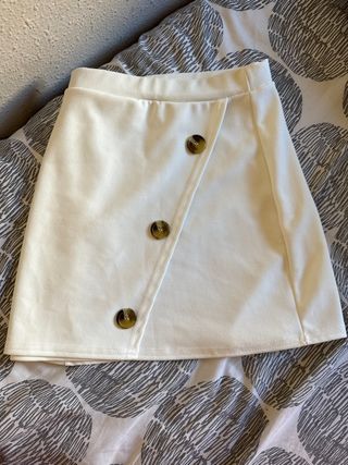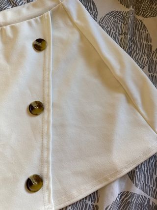 Falda corta de color blanco con un diseño moderno. - Detalle de tres botones decorativos en la parte frontal. - Corte asimétrico. - Cintura elástica.