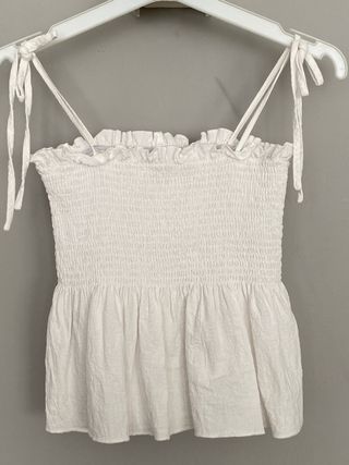 Precioso top blanco con detalle de nido de abeja. - Tirantes ajustables con lazada. - Diseño elástico en el torso. - Falda con textura.