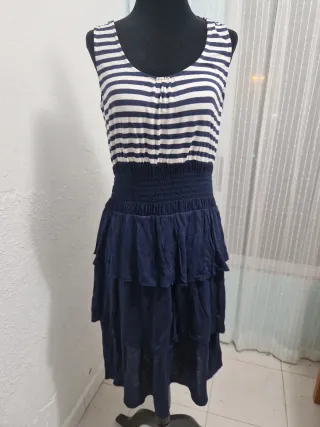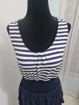 Vestido de verano con un diseño de rayas en la parte superior y falda con volantes. - Parte superior a rayas blancas y azul marino. - Cintura elástica fruncida. - Falda de volantes en azul marino.