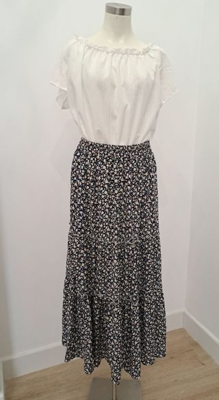 Falda larga de corte bohemio con un diseño de volantes. (la tienda no la sé, he puesto esa porque no sé cuál es y el campo es obligatorio) - Cintura elástica (se adapta a cualquier cuerpo) - Tejido con textura.