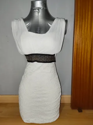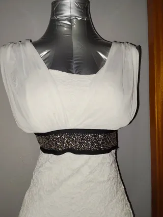 Elegante vestido blanco con un cinturón adornado. - Diseño con escote drapeado. - Cinturón con pedrería y detalles dorados. - Falda de encaje ajustada. - Tirante con tela de gasa para tapar los tirantes ajustables para que quede el vestido perfecto