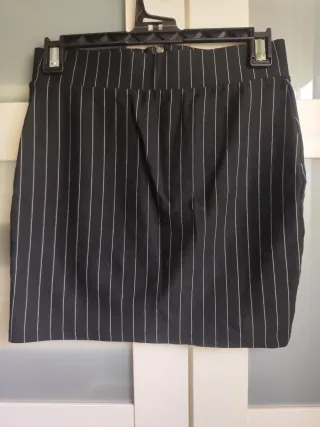 Minifalda con un diseño de rayas verticales blancas sobre fondo negro. Con una cremallera plateada en la parte delantera. En perfecto estado.