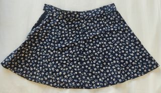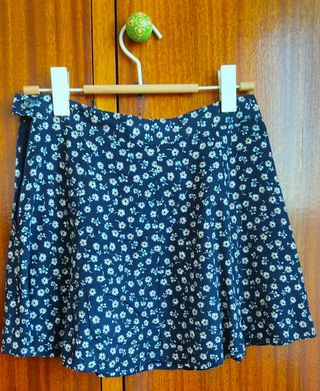 Falda de hilo fresquita. Es azul marino con florecillas blancas y marrón clarito. Se abrocha con cremallera lateral y botón en la cintura. Tiene una caida muy bonita, es fluida y con vuelo. Talla S.PRECIO NEGOCIABLE!