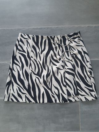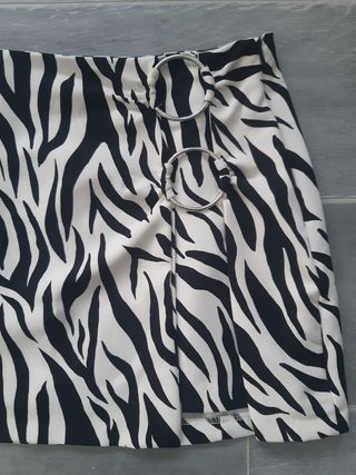 Preciosa minifalda de Bershka con estampado de cebra en blanco y negro. Talla s. Con cremallera lateral y 2 argollas en la parte delantera. Usada un par de veces. Está en perfecto estado.