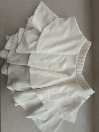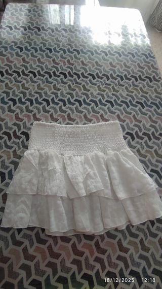 Falda corta de verano en blanca.Talla 42-44.Cintura elástica.Tejido tela perforada con forro interior de tela fina..Tiene bolsillos.Marca Girasoles.