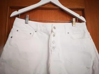 Preciosa minifalda blanca de algodón. Ideal para el verano. - Tiene dos bolsillos delanteros y dos traseros. - Cierre con cremallera y botón.