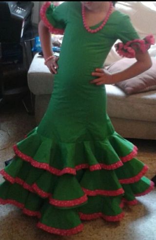Traje de flamenca con un diseño elegante y llamativo. POSIBILIDAD DE UNO A JUEGO PARA UNA NIÑA DE 5 AÑOS. LO TENGO TAMBIEN (mirar ultima foto y hablarme para informacion) - Color verde con detalles blancos. - Mangas largas con volantes. - Falda con múltiples volantes escalonados. - Adornos blancos en los bordes de los volantes.