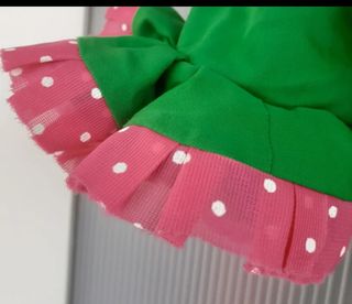 Vestido de Niña de flamenca color Verde andalucía y con carrucha fusia con lunares blancos talla 6-7 años .medidas 100 cm de largo y ancho 31 cm ( de axila a axila) . lleva bolsillo en la falda