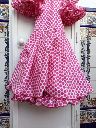 Precioso traje de flamenca para niña, ideal para cualquier evento. Es de color rosa y blanco con lunares. - Diseño de volantes en la falda y mangas. - Confeccionado en un tejido ligero y fresco. - Perfecto estado.