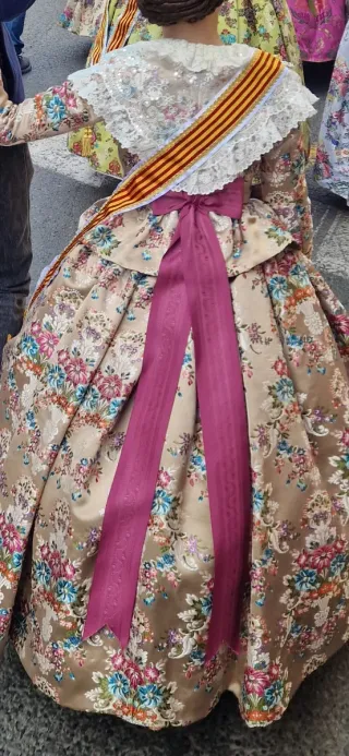 Traje de fallera para niña 7 años, con un diseño elegante y tradicional. Largo de falda 82 cm. cintura 60 cm. cuerpo de hombro a hombro 34 cm. largo manga 44 cm. largo cuerpo a cintura 29 cm. y 7 cm de faldilla - Cuerpo con mangas largas y detalles de puntilla. - Falda con volantes y lazo decorativo. - Cuello adornado con bordado. - Puños y bajo con puntilla. Si quieres las manteletas son 20 euros mas