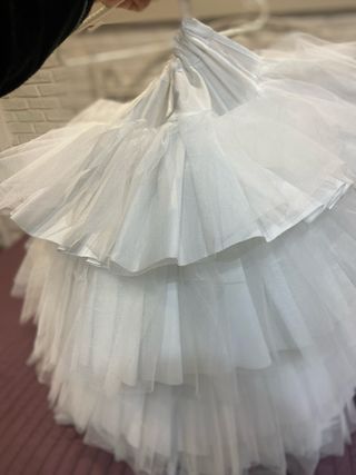 Cancán de tul blanco para fallera niña.Ideal para dar volumen a la falda. - Tejido de tul. - Adorno de puntilla en el bajo - Cintura ajustable con belcro. - Pocas puestas. - 85 L c largo.