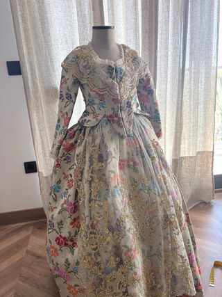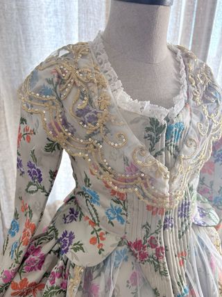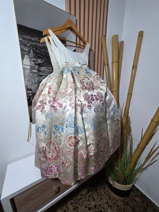Traje de fallera para niña, adecuado para edades de 6 a 8 años. Presenta un diseño floral vibrante y detalles dorados. - Tejido con estampado floral multicolor. - Adornos dorados en cuello y falda. - Mangas largas. - Incluye enagua con dos aros - Aderezo de cristal (le faltan algunas piedrecitas) - Mantilla blanca rectangular