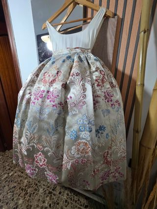 Precioso traje de fallera para niña, con un diseño elegante y detalles dorados. - Tejido principal blanco con motivos florales y ornamentales. - Bordados y pasamanería en hilo dorado. - Incluye corpiño y falda.