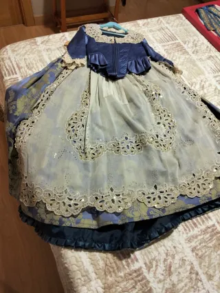 Precioso traje de fallera para niña, con un diseño elegante y detallado. Traje a estrenar para niña de 3 años. Hay tela guardada en la falda y el corpiño para dos años más. Las manteletas no están incluidas. Doy la tela para forrar zapatos