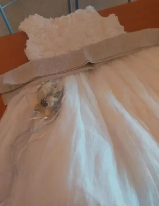 Precioso vestido de comunión para niña, en tonos beige y blanco. Ideal para una ocasión especial. Un solo uso. Ver fotografía con las medidas. Se puede añadir zapatos Conguitos by Corte Inglés, beige talla 37. Ultra cómodos. Sumar 20€ - Vestido de talle alto con cuerpo de piqué. - Falda vaporosa de tul. - Cinturón de raso beige con flor decorativa. - Manga sisa.