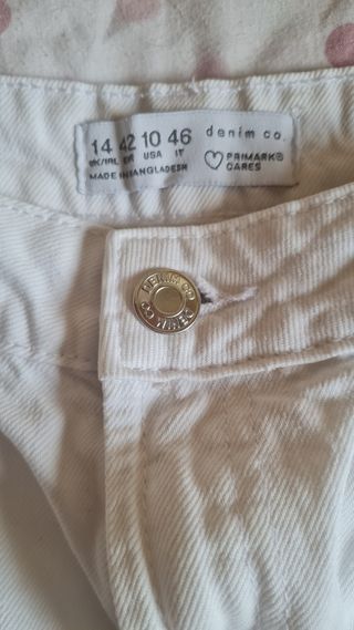 Conjunto de tres prendas de ropa, ideal para un look casual. - Una falda blanca vaquera con acabado deshilachado (talla 36, marca denim go - Dos pantalones de corte recto, uno liso en color beige (talla 38, marca primark) y otro con estampado geométrico (talla m, marca berskha.