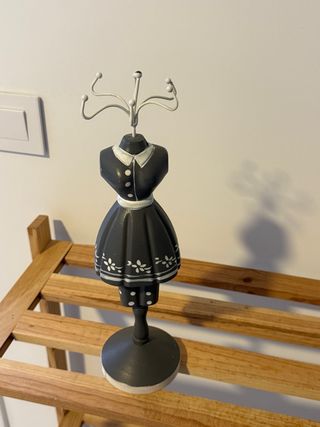 Original joyero con forma de figura de vestido, ideal para organizar tus accesorios. - Diseño elegante en color negro y blanco. - Soporte con múltiples colgadores para collares y pulseras. - Adornos florales en la falda.