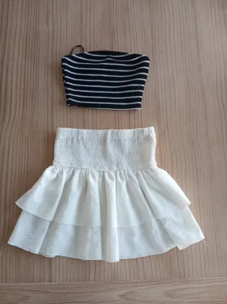LAS DOS PRENDAS POR 4€. Conjunto de falda y top a juego. - Top tipo bandeau con rayas blancas y negras. - Falda blanca con vuelo y dos volantes. - Cintura elástica en la falda.