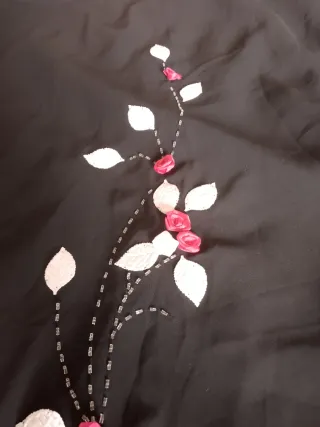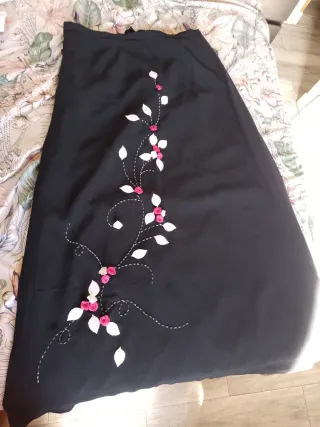 Falda negra con un bonito diseño de flores y pedrería. - Detalle de flores en relieve. - Adorno de pequeñas cuentas plateadas. - Diseño floral con pétalos blancos y rosas.