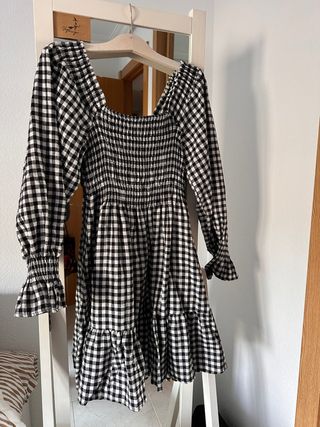 Vestido con estampado de cuadros vichy en blanco y negro. Presenta un diseño con escote cuadrado y mangas largas abullonadas. - Escote cuadrado. - Mangas largas abullonadas con volante. - Falda con volantes.