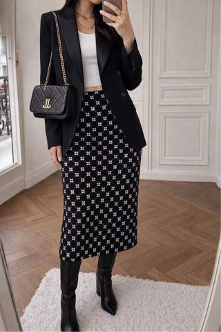 Elegante falda lápiz con estampado de cuadros. - Diseño clásico. - Corte entallado. - Ideal para ocasiones formales o informales.