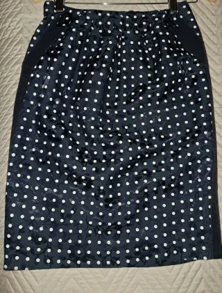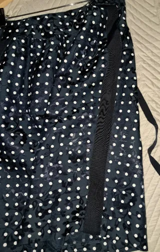 Elegante falda de Purificación García con un diseño único. - Tejido con estampado de lunares blancos sobre fondo azul oscuro. - Detalle de flores en relieve integradas en el diseño. - Adorno lateral de cinta negra con textura. - Pequeño volante delantero. - Lazo en cintura para ajustar