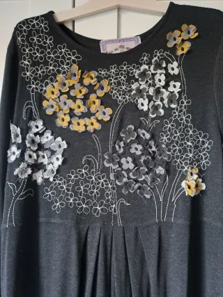 Vestido de manga larga con un bonito estampado floral en la parte delantera. El diseño presenta flores en relieve y detalles bordados. - Flores bordadas en blanco y gris. - Flores en relieve en tonos amarillo y gris. - Falda con pliegues.