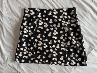 Falda corta con un alegre estampado de flores blancas sobre fondo negro. - Diseño de flores blancas y centro amarillo - Corte moderno y favorecedor con pequeñas aberturas laterales - Se ajusta a la cintura pero no es de tubo