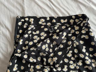 Falda con estampado floral sobre fondo negro. Tiene un diseño cruzado con volantes y un lazo lateral. - Estampado de flores blancas. - Diseño cruzado. - Volantes en el bajo. - Cierre con lazo. -Muy fresca y cómoda -Igual que nueva apenas usada