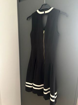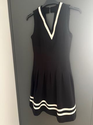 Vestido negro con detalles blancos. - Cuerpo ajustado. - Falda con vuelo. - Ribete blanco en escote. - Rayas blancas en el bajo.