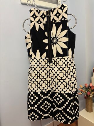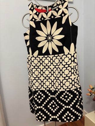 Vestido de la marca Desigual con un diseño llamativo. - Estampado floral grande en la parte superior. - Patrones geométricos en la falda. - Cremallera en la espalda.