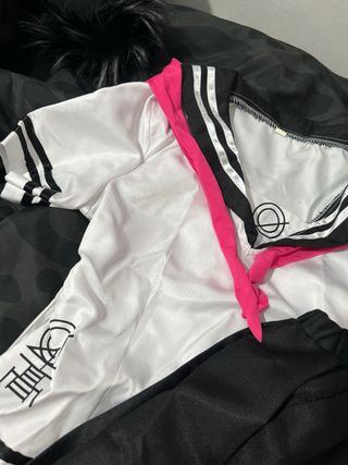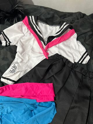Conjunto de cosplay de Ibuki Mioda del juego Danganronpa. - Incluye top blanco con detalles de rayas y lazo rosa. - Falda negra plisada. - Accesorios de mallas rosas y azules.
