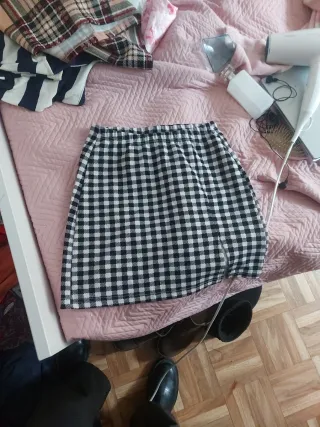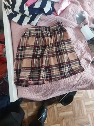 *Vendo 2 faldas con estampado de cuadros en tonos beige y multicolor. Tienen diseño moderno y versátil. - Cintura elástica. - Tejido ligero. Una de ellas tiene una mancha amarilla *Vendo un short blanco talla 11-12 ZARA Los 3 objetos a 4 euros