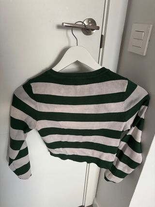 Jersey crop de rayas verdes y blancas de Zara, talla XS Tejido de punto fino, muy cómodo y favorecedor. Corte corto (crop) ideal para llevar con vaqueros de tiro alto, faldas o pantalones cargo. Perfecto para entretiempo o primavera. Marca: Zara Talla: XS (USA S / MEX 26) Color verde botella y blanco Corte crop tendencia En muy buen estado Un básico con toque trendy que nunca pasa de moda Si necesitas medidas o más fotos, escribeme sin problema.