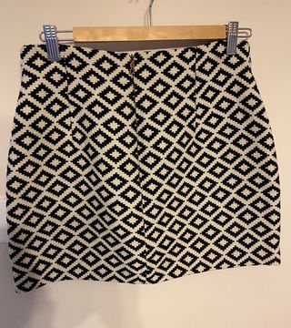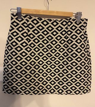 Mini falda de invierno de Zara Basic, talla M. Tela de invierno, no es elástica. Apertura y cierre mediante cremallera en el lateral, dos botones en la parte delantera decorativos. Forrada. Diseño geométrico en blanco y negro.