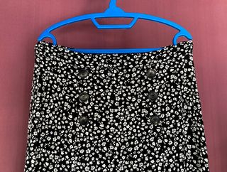 Falda midi con un estampado floral blanco sobre fondo negro. Presenta una hilera de botones en la parte delantera y una abertura. - Diseño midi. - Estampado floral. - Cierre de botones.