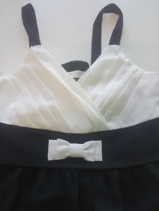 Vestido de gasa con un diseño elegante en dos tonos. - Cuerpo superior blanco plisado. - Cinturón negro con detalle de lazo blanco. - Falda negra. - Volantes blancos en el bajo.