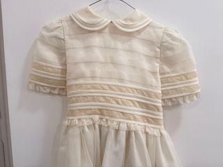 Elegante traje de comunión para niña, con un diseño delicado y detalles de encaje. - Tejido principal en tonos beige y blanco. - Mangas cortas abullonadas. - Cuello Peter Pan con ribete. - Fajín y detalles de encaje en la cintura y mangas. - Falda con varias capas y puntilla.