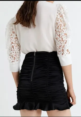 Falda midi de Zara con un bonito estampado floral y un detalle de volante en el bajo. - Diseño con bordados blancos sobre fondo marrón. - Cierre lateral cremallera invisible. - Bajo con volante. - Largo midi. - Medidas: Cintura 41cm Cadera 50cm Largo 85cm