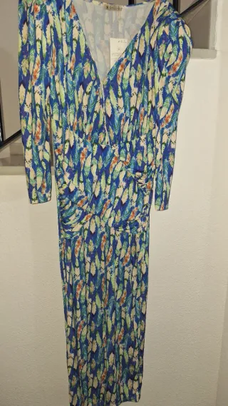 Vestido de Zara con un estampado floral vibrante. - Diseño sin mangas. - Falda con vuelo. - Estampado detallado en azul y blanco.