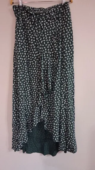 Falda larga con estampado floral en tonos verdes y blancos. Presenta un diseño con botones en la parte delantera y una abertura. - Estampado de pequeñas flores blancas sobre fondo verde. - Cierre de botones. - Abertura frontal.