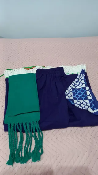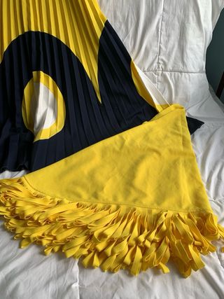Pack compuesto por un vestido hecho a mano y un pañuelo amarillo a juego. El vestido es una pieza artesanal, con cuerpo plisado en amarillo y falda con diseño circular en tonos azul, blanco y amarillo. Es una prenda única, con mucho movimiento y un estilo muy especial. Incluye un pañuelo amarillo con flecos que combina perfectamente con el vestido. El conjunto tiene algún pequeño desgaste/manchita por el uso, pero en general está en buen estado.