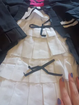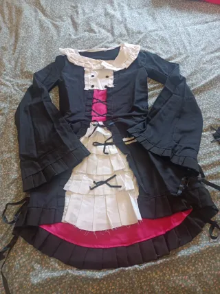 Vestido estilo Lolita con detalles en negro y rosa. Presenta un diseño con volantes y lazos. Traje de Lolita. de Yuki nagato de Haruhi Suzumiya - Cuello blanco con volantes. - Corsé rosa en el centro. - Mangas acampanadas con volantes. - Falda con varias capas de volantes blancos y negros. - incluye cofia