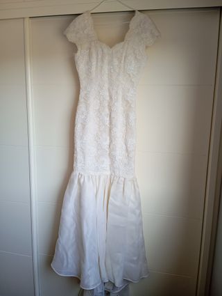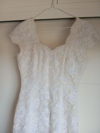 Elegante vestido de boda con detalles de encaje. - Cuerpo con escote ilusión y mangas cortas. - Falda de corte A con varias capas de tul. - Adornos de encaje en el bajo. El motivo de la venta es la cancelación de la boda.