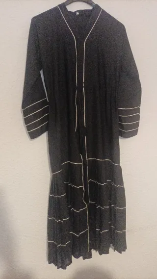 Elegante abaya de color negro con un diseño moderno y detalles en blanco. - Diseño con ribetes blancos. - Mangas con detalles de líneas blancas. - Falda con capas y detalles de líneas blancas.