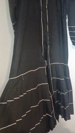 Falda de ensayo para flamenco, talla TS. Diseño elegante y cómodo. - Tejido principal negro. - Detalle de estampado geométrico en blanco y negro. - Volantes en el lateral.