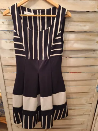 Vestido elegante con un diseño de rayas clásico. - Diseño de rayas verticales en la parte superior. - Falda con paneles de rayas horizontales y verticales. - Cintura marcada con pliegues. Puede ser tambuen una talla 40