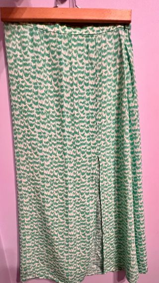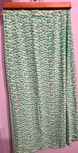 Falda larga ligera con un bonito estampado en tonos verdes y blancos. - Largo hasta por encima de los tobillos. -Cierre por cremallera lateral. - Abertura lateral anterior para mayor comodidad. - Estampado abstracto y moderno. -Medidas: cintura 34cm, anchura bajo 63cm, largo 82cm. -Composición: 100% viscoso.