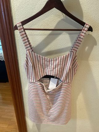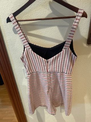 Falda con un diseño de rayas verticales y horizontales en tonos rojos y blancos. La parte superior presenta un patrón de rayas verticales finas, mientras que la parte inferior tiene un diseño de rayas horizontales con un patrón de zigzag. - Diseño de rayas verticales en la parte superior. - Patrón de zigzag en las rayas horizontales de la parte inferior. - Tirantes anchos con diseño de rayas.