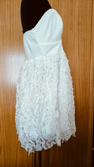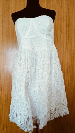 Elegante vestido blanco sin tirantes, con un diseño texturizado en el corpiño y una falda de encaje delicado. - Corpiño con textura. - Falda con detalle de encaje floral. - Diseño strapless. - talla 3XL pero vale desde la XL